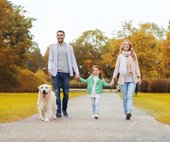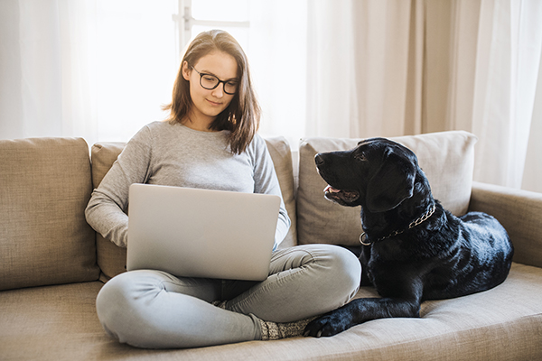 Photos of family walking dog and women with laptop and dog courtesy of Adobe Stock. Photo of girl with backpack courtesy of Getty Images.
